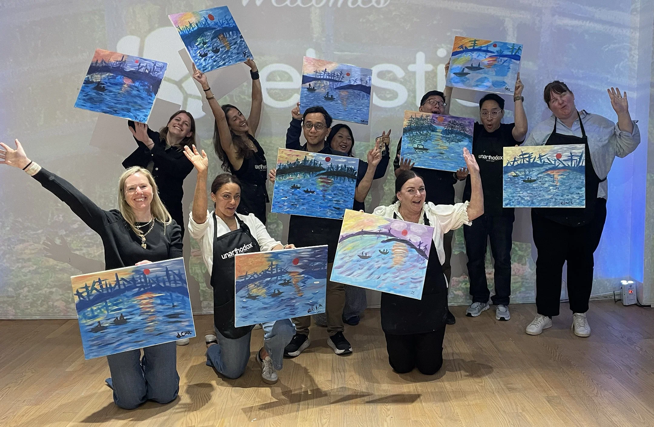 Designed for corporate outings and team events, the experience begins with a dynamic introduction to Impressionism and Monet’s artistic vision, setting the stage for an engaging creative session. Guests are surrounded by immersive visuals and curated music inspired by Monet’s world while participating in a guided, step-by-step painting experience that captures his signature style. Throughout the session, participants have space for personal interpretation while enjoying a welcoming, social atmosphere that encourages collaboration, conversation, and connection.